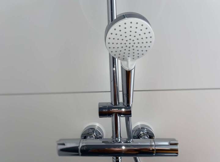 Mit viel Platz neben Dusche und Badewanne ist das Tageslichtbad eine absolute Wohlfühloase. Dunkle Bodenfliesen werden mit hellen Bodenfliesen für einen modernen Look kombiniert. In dieser Wohnung verbindet sich Moderne mit idyllischer Natur. Ein Außenstellplatz im Innenhof wird für 8.000 € zusätzlich erworben.