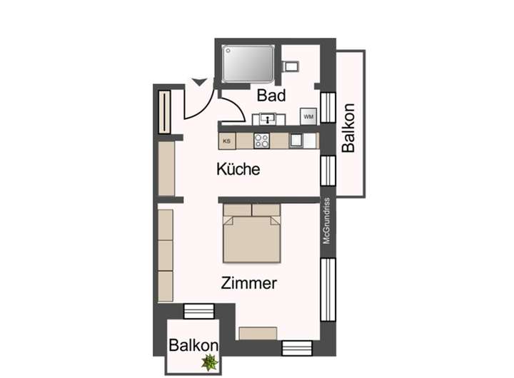 Beim Betreten dieser schönen 1-Raum-Wohnung fällt sofort der offene, lichtdurchflutete Grundriss der Wohnung auf. Sie gelangen über den praktischen Flur über die Küche in den offenen Wohn- und Essbereich mit Zugang zum Balkon in Süd-Ausrichtung. Ein weiterer schöner Balkon in Ost-Ausrichtung lädt am Morgen auf ein schönes Frühstück im Freien ein.