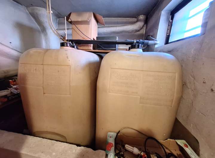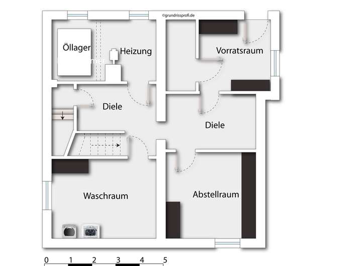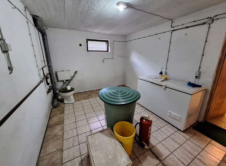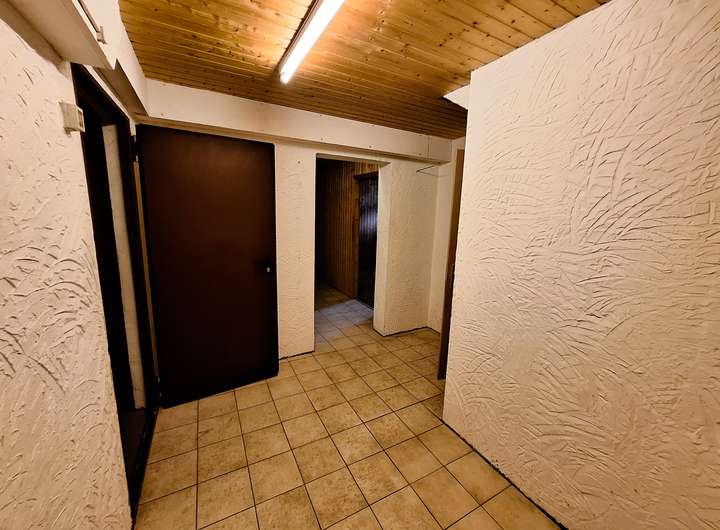 Der Keller ist geräumig und beherbergt einen Waschraum, einen Abstellraum, einen Heizraum mit abgemauertem Öllager sowie einen Vorratsraum, der nochmals unterteilt ist. Vom Vorratsraum aus besteht die Möglichkeit, durch eine Metalltür in den überdachten Durchgang zur Garage zu gelangen.