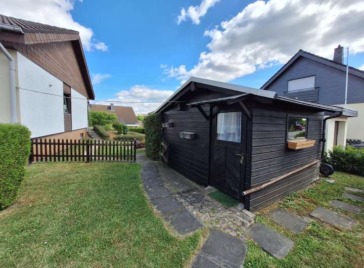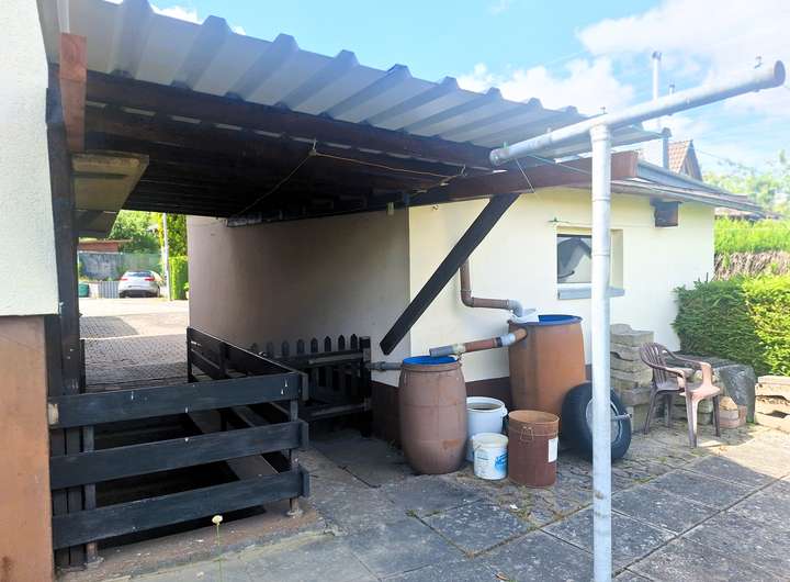 Der Gartenbereich ist sehr schön angelegt und bietet neben der Garage und dem Gartenhaus, einen überdachten Freisitz, einen Gartenteich und ein etwas baufälliges kleines Gewächshaus.