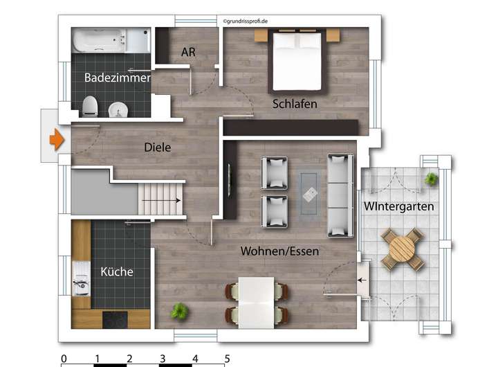 Sie betreten das gemütliche Haus über eine Treppe und gelangen durch die Eingangstür in die geräumige Diele. Linker Hand befindet sich das großzügige Badezimmer mit Wanne und Dusche. Im Uhrzeigersinn folgen ein Abstellraum, das Schlafzimmer mit fast 20 m² sowie der große Wohn-Essbereich (ca. 24 m²) und den Treppenabgang in den Keller. Vom großen Wohn-/Essbereich aus gelangen Sie in die Küche und vom Wohnzimmer aus erreichen Sie den 12,5 m² umfassenden Wintergarten.