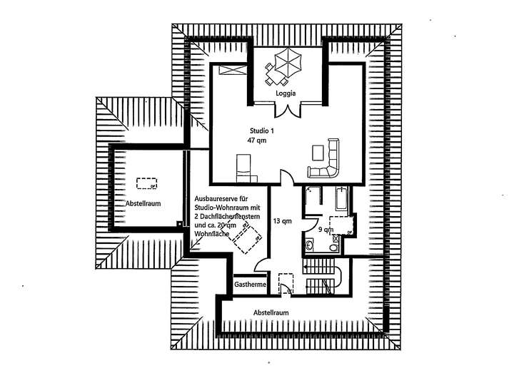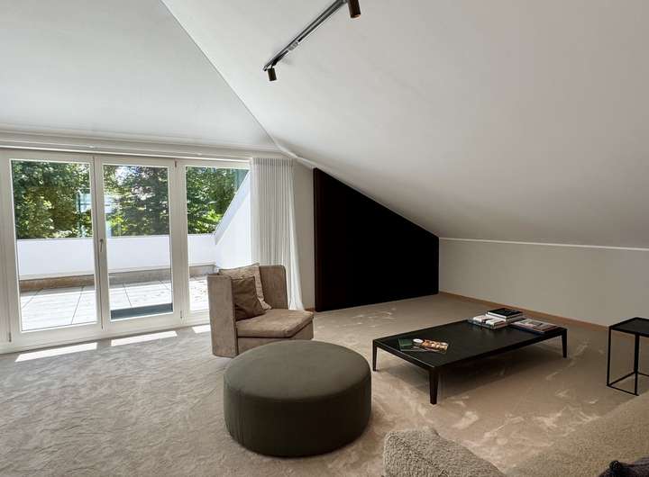 In die zweite Ebene gelangt man über den formschönen Treppenaufgang. Das große Studio mit ca. 60 m² wird durch die Loggia lichtdurchflutet und lässt Wohnen auf höchstem Niveau zu. Ein modernes Bad ermöglicht eine weitere Privatsphäre.