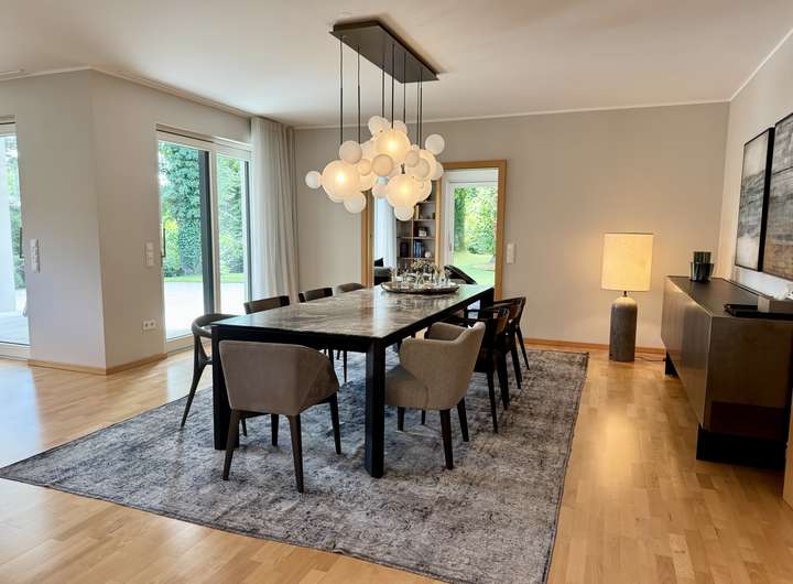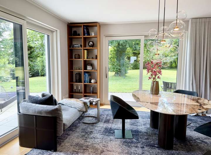 Ansprechende Architektur, Verschmelzung von Moderne und Wärme und viele Glasfronten mit Blick in den Park bestimmen die Atmosphäre des Anwesens. Insgesamt vier Terrassen bieten vielfältige Möglichkeiten, das Wohnen auf den Park und seine Ruhe auszudehnen.