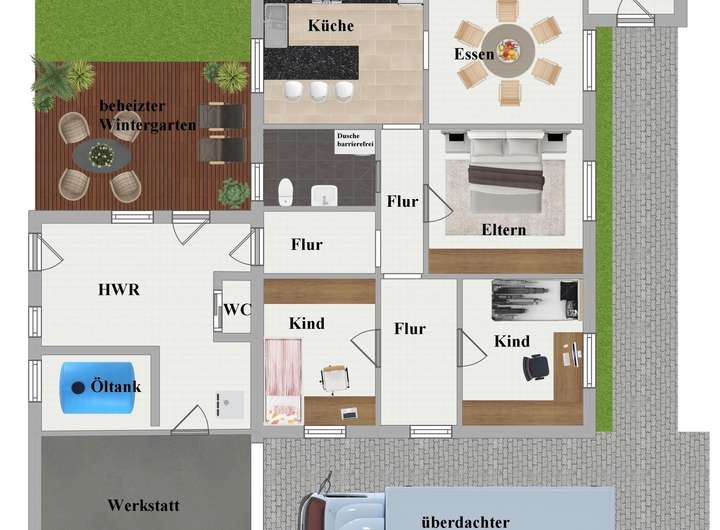 Erdgeschoss: Wohnzimmer, Wintergarten, Schlafzimmer, 2 Kinderzimmer, Esszimmer, Küche, Bad, WC, HWR, Flure