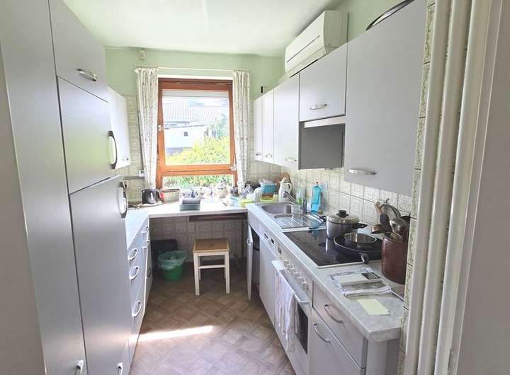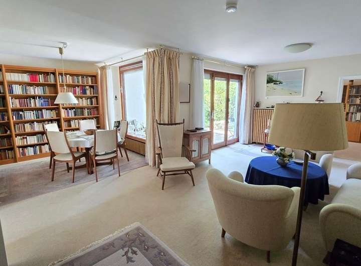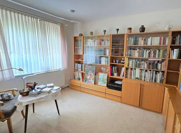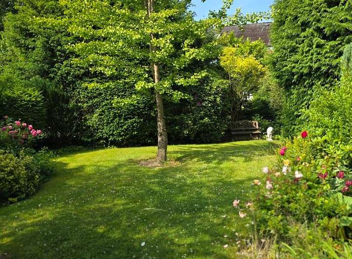 Es bietet im Erdgeschoss eine vollständige Wohnung, die schon weitgehend barrierefrei gestaltet ist. Herzstück des Hauses ist das große und lichtdurchflutete Wohn- und Esszimmer. In dessen hinterem Bereich ist noch ein weiterer Raum angegliedert. Auch der Zugang auf die geschützte, sehr gemütliche Terrasse und in den Garten erfolgt aus dem Wohnzimmer. Im Erdgeschoss befinden sich, durch einen Flur optisch etwas abgegrenzt, noch zwei weitere Räume sowie die Küche (mit Klima-Splitgerät) und das Wannenbad. Der großzügige Eingangsbereich verzweigt noch zu einem Gäste-Bad mit Dusche sowie einer Garderobe. Weiterhin gelangt man von hier aus in den Keller sowie in das Dachgeschoss.