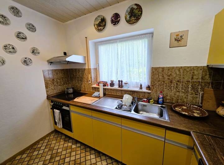 Durch die Diele zu erreichen, bildet das Herzstück des Hauses das geräumige Wohnzimmer mit Zugang zu Garten und Terrasse. Die kompakte, in die Jahre gekommene Küche, erfüllt größentechnisch alle Anforderungen eines kleinen Haushaltes.