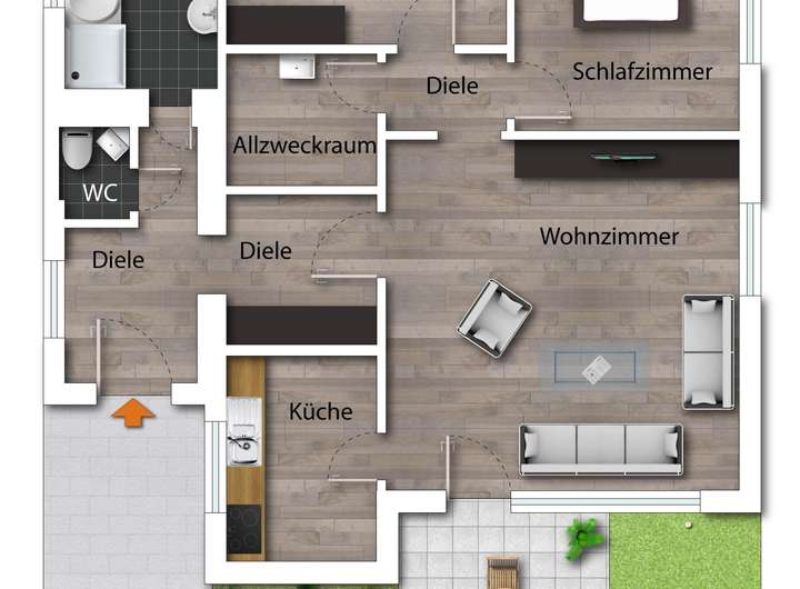 Der knapp 4 m² große Abstellraum, beherbergt die Heizung, Waschmaschine und Trockner. Das Schlafzimmer ist fast 11 m² groß, während das kleinere Zimmer mit ca. 8 m² als Kinderzimmer, Gästezimmer oder Büro genutzt werden kann. Das Bad ist geräumig mit Badewanne und Dusche. In diesem Haus befindet sich alles auf einer Ebene.