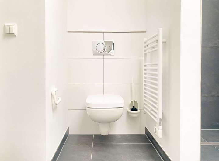Auf der rechten Seite der Wohnung befindet sich das geräumige Schlafzimmer. Das Badezimmer verfügt über eine Dusche und eine Badewanne und kombiniert dunkle und helle Bodenfliesen für einen modernen Look. Die Wohnung bietet ausreichend Platz und verbindet moderne Elemente mit der Idylle der umgebenden Natur.