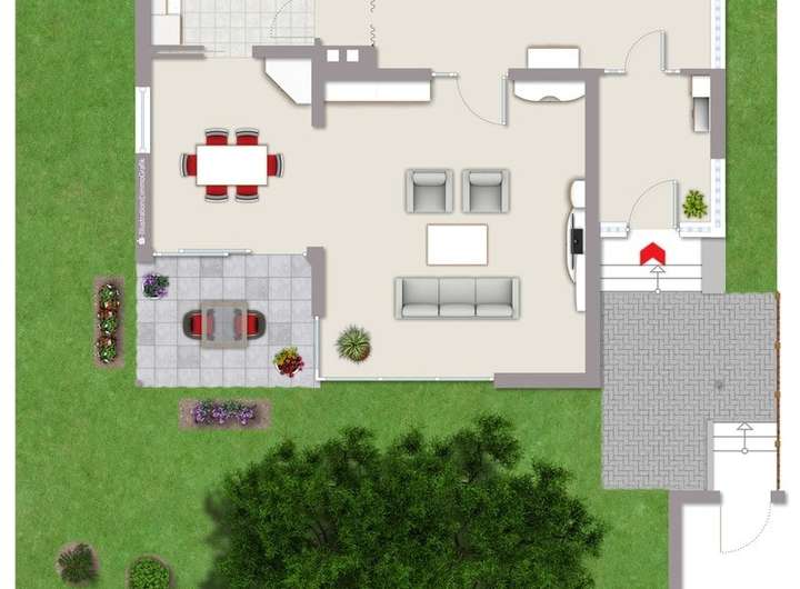 Erdgeschoss: Windfang, Flur, Arbeitszimmer, WC, Küche mit Speisekammer, Wohn- und Esszimmer mit Ausgang zur überdachten Terrasse und in den Garten.