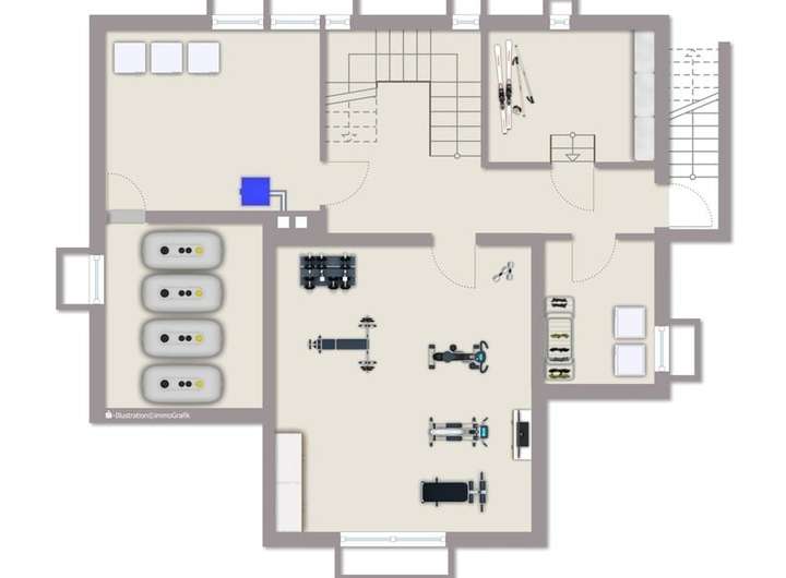 Untergeschoss: (voll unterkellert) Heizraum, Heizöllagerraum, Hobbyraum, Waschküche, Kellerraum und Flur mit Ausgang in den Garten.