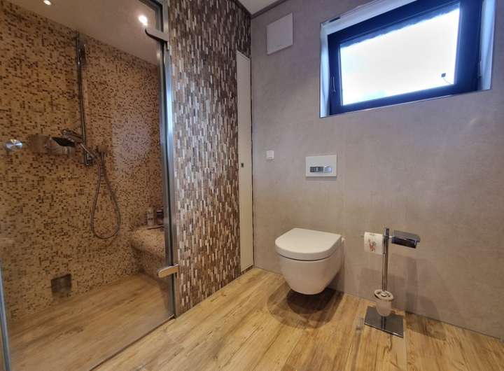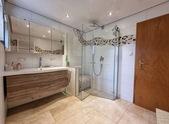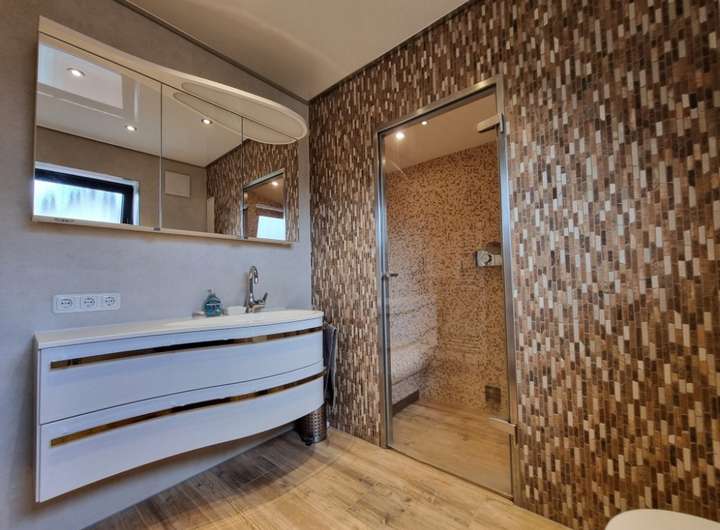 zwei exklusive Bäder mit großformatigen Fliesen, Natursteinen und maßgeschneiderten