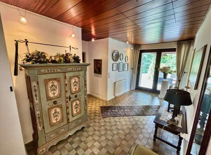 Ein besonderes Highlight ist der wohnlich ausgebaute Keller, der zusätzlichen Raum für Hobbys, Gäste oder ein Homeoffice bietet. Die großzügige Doppelgarage bietet Platz für zwei Fahrzeuge sowie zusätzlichen Stauraum. Ein Gewächshaus ist ebenfalls vorhanden.