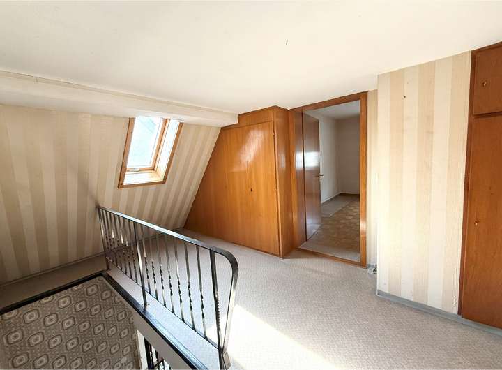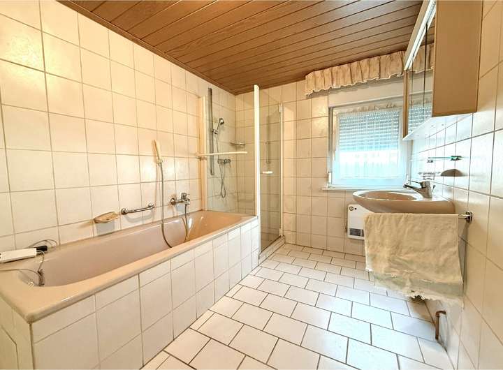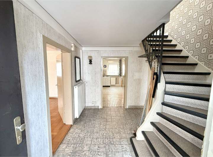 Im Erdgeschoss erwartet Sie eine großzügige Küche mit anschließendem Esszimmer, ideal für gesellige Abende und Familienmahlzeiten. Das helle Wohnzimmer lädt zum Verweilen ein, während ein Schlafzimmer im Erdgeschoss zusätzlichen Komfort bietet. Das Tageslichtbad mit Wanne und Dusche ist praktisch gestaltet. Die Waschküche befindet sich direkt dahinter. Unter der Treppe befindet sich ein nützlicher Abstellraum, der zusätzlichen Stauraum schafft.