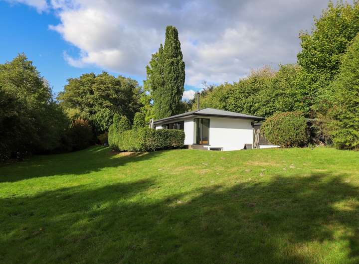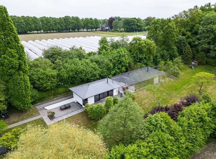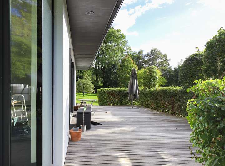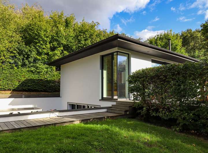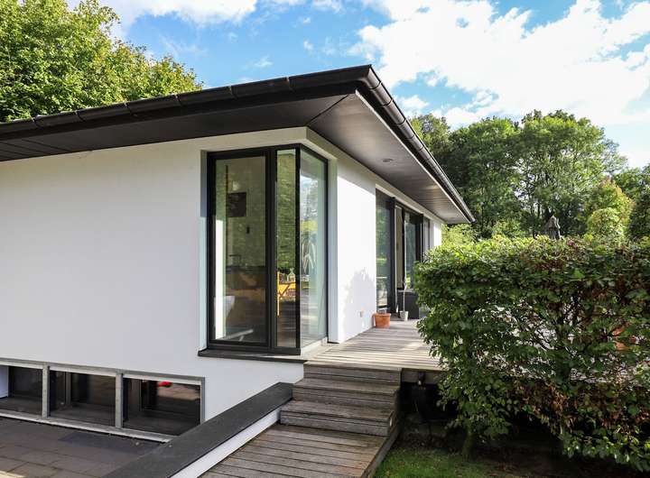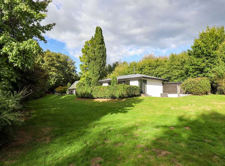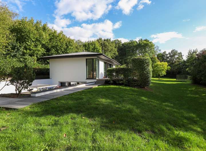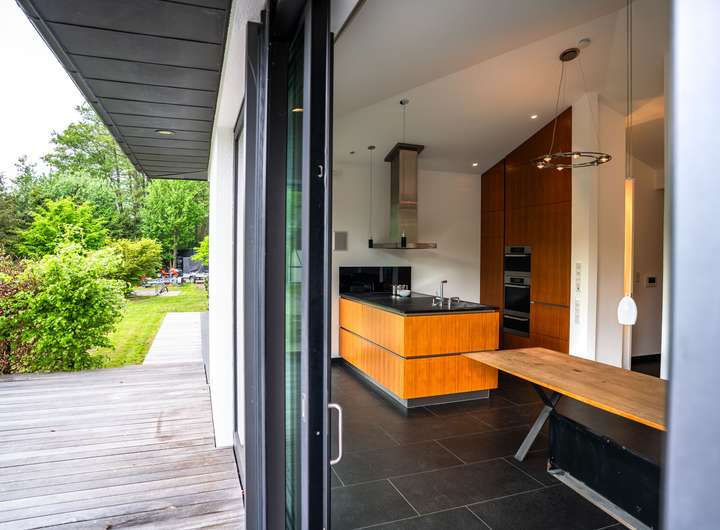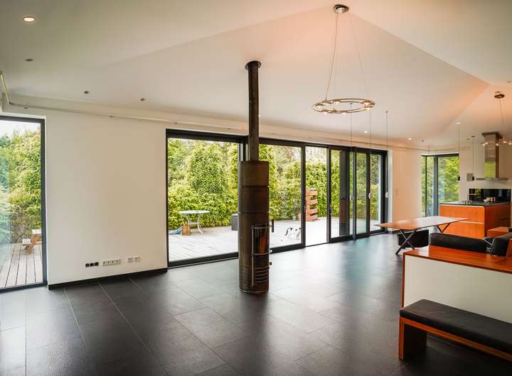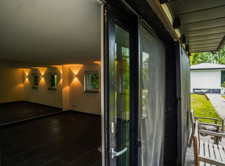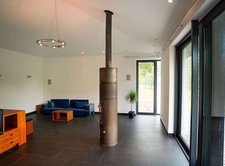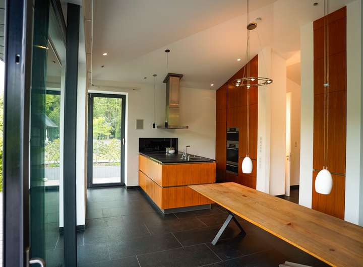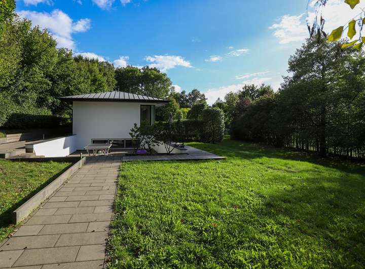 Im Jahr 2013 wurde das Ensemble in Form zweier hochwertiger Gebäude errichtet: Das Haupthaus mit ca. 135 m² Wohnfläche erstreckt sich über ein ebenerdiges Geschoss mit ausgebautem Souterrain und bietet eine moderne, lichtdurchflutete Architektur mit klaren Linien, offenen Übergängen und raumhohen Fenstern. Sämtliche Wohnräume sowie die großzügige Sonnenterrasse sind nach Südwesten ausgerichtet und profitieren bis in die Abendstunden von direktem Sonnenlicht. Besonders stimmungsvoll: Der markante Kaminofen im Wohnbereich, der in Kombination mit der Natursteinverfliesung, den integrierten Leuchten und der maßgefertigten Holz-Einbauküche mit Miele-Geräten und Qooker ein stilvolles, zeitloses Ambiente schafft.