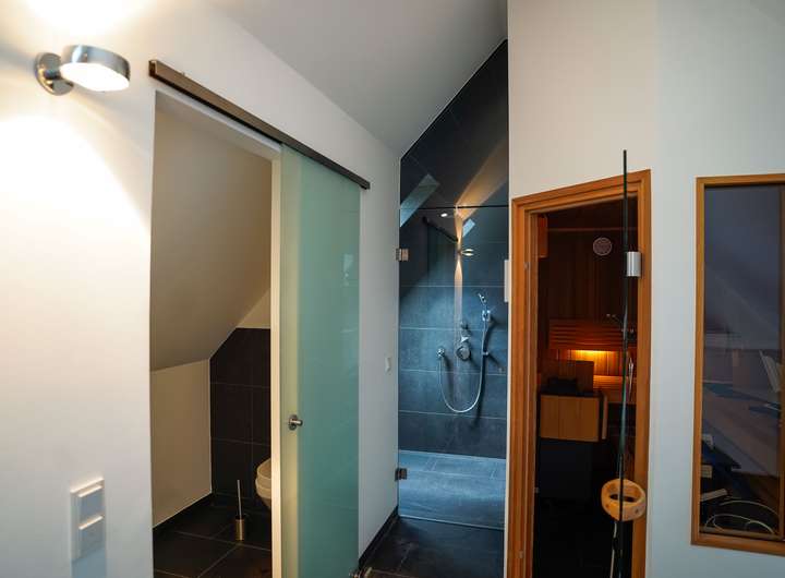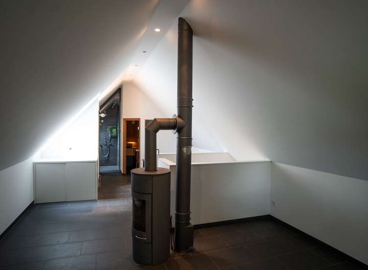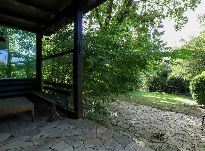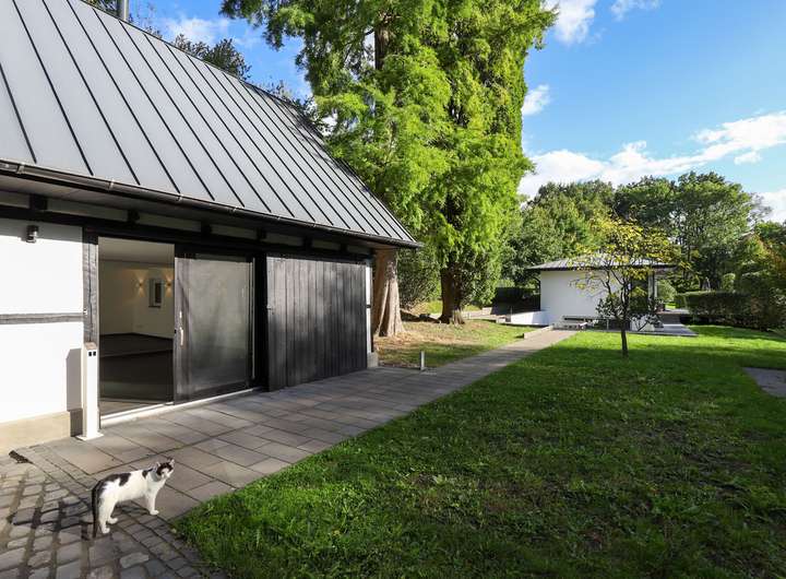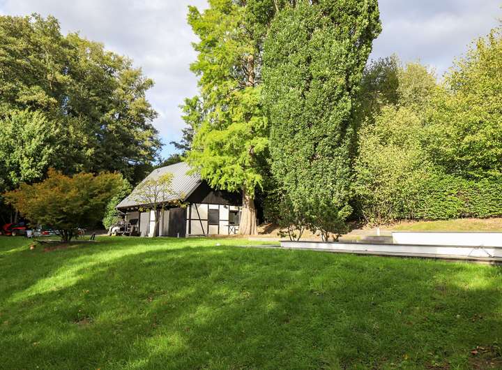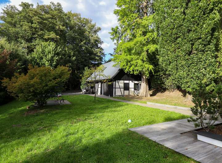 Das zweite Gebäude – ein massives, traditionell gestaltetes Nebengebäude in Fachwerkoptik – verfügt über etwa 100 m² Wohnfläche plus ausbaufähiger Garage. Es eignet sich ideal als Gästehaus, Atelier, Büro oder für heranwachsende Kinder. Auch hier wurden hochwertige Materialien verwendet: Holz-Sicherheitsfenster mit Dreifachverglasung, eine eigene Sauna, Kaminanschluss sowie ebenfalls Erdwärme mit Fußbodenheizung bieten Wohnkomfort auf höchstem Niveau.