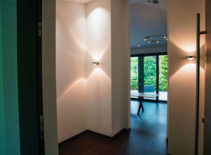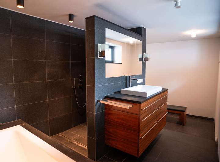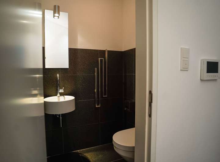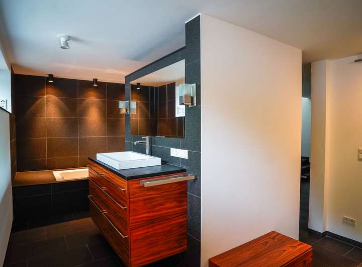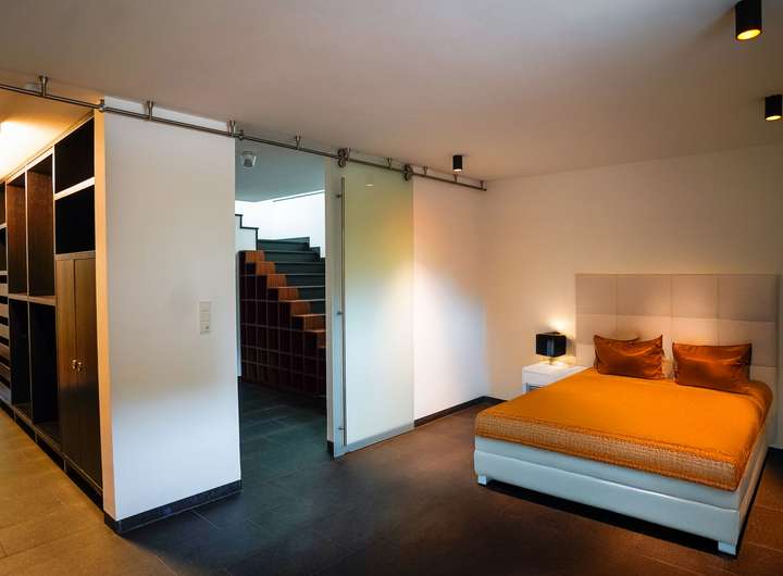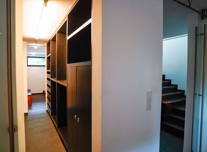 Im Untergeschoss befinden sich zusätzliche Räume mit Tageslichtnutzung – ideal als Arbeitszimmer, Gästezimmer oder Rückzugsort. Eine Fußbodenheizung über Erdwärme (zwei Bohrungen) sorgt in beiden Ebenen für angenehme Wärme. Türen mit Magnetschlössern, elektrische Raffstores, hochwertige Natursteinböden und eine durchdachte Lichtplanung runden das technische Konzept ab.