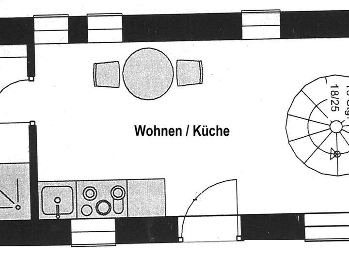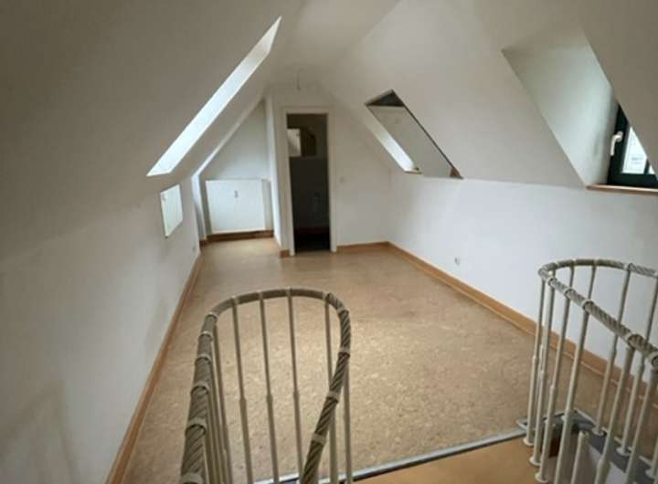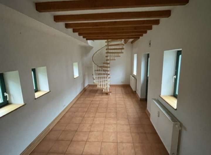Massive Außenwände mit Fachwerk, Satteldach mit Dachziegeln, Holzfenster mit Isolierverglasung, Zementestrich mit Wärmedämmung, Gas - Zentralheizung mit zentraler Warmwasserversorgung, Bodenfliesen im Erdgeschoss, Korkbelag in dem Schlafraum, im Dachgeschoss mit Schrägen, Badezimmer mit Dusche, Waschbecken und WC, Wendeltreppe in das Schlafzimmer im 1. Obergeschoss. Idyllische Außenfläche zum Verweilen im Innenhof. Zu der Wohnung gehört 1 PKW - Außenstellplatz, der sich vor dem Gebäude befindet.