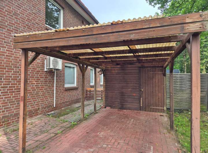 Zur Doppelhaushälfte gehört außerdem ein Carport mit einem praktischen Geräteraum.