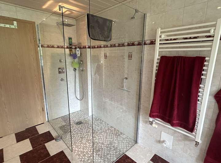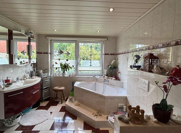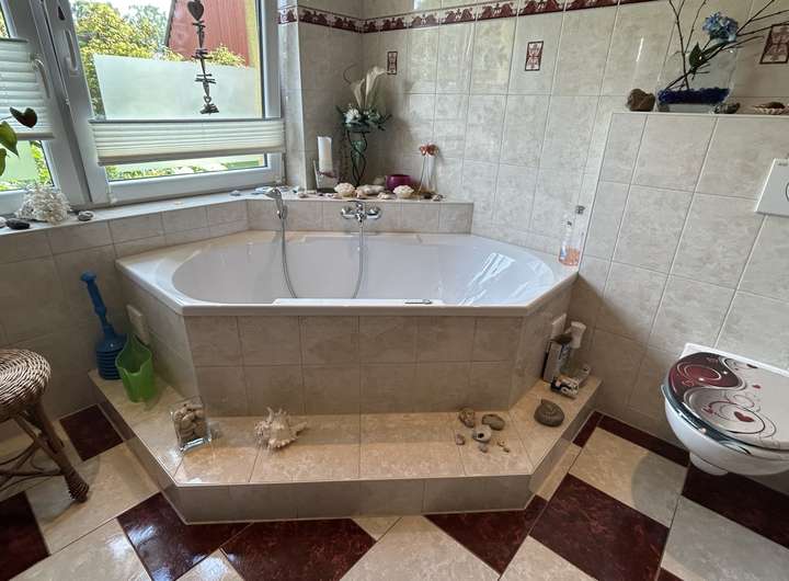 - Sanitär: Eckbadewanne, große Dusche, Waschbecken, Vorwand-WC, Handtuchtrockner