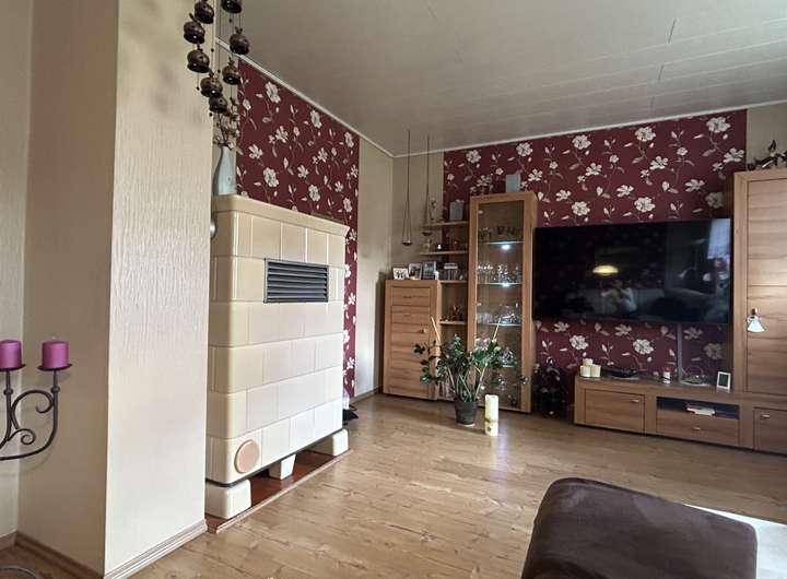 Im Erdgeschoss erwartet Sie ein großzügiges Wohnzimmer mit einem gemütlichem Kachelofen, der Sie im Winter mit wohliger Wärme verwöhnt.