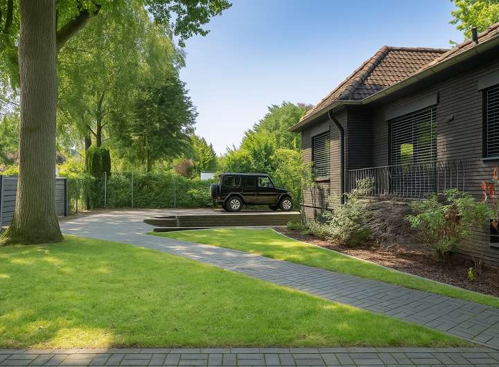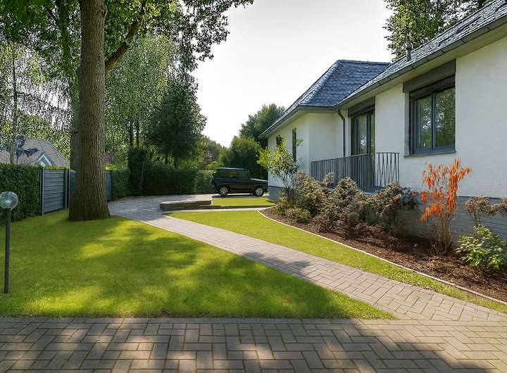 Das Grundstück ist vollständig eingefriedet, die Vorgartenanlage wurde neu angelegt, ebenso die Pflasterflächen im Eingangsbereich. Auf dem Grundstück befinden sich Stellplätze für bis zu fünf Fahrzeuge (inklusive der Garage).