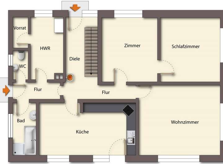Flur/Dielenbereich, Gäste-WC, Bad, Hauswirtschaftsraum (+ kl. Abstellraum), Wohnküche, 3 Zimmer