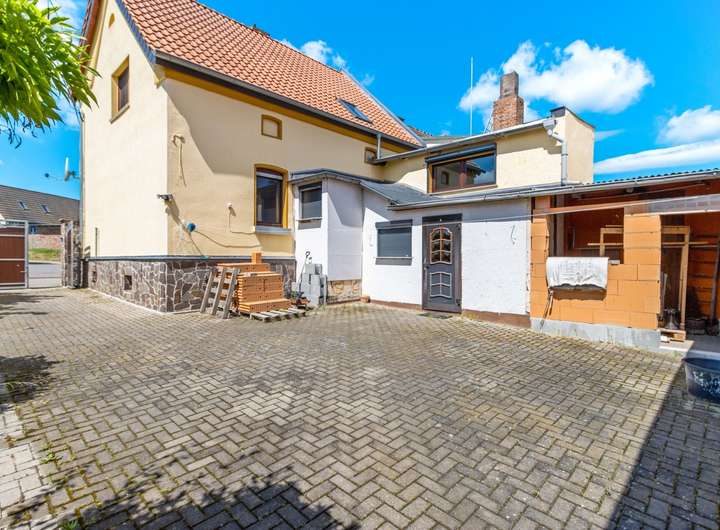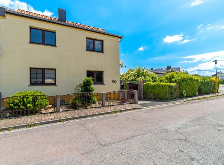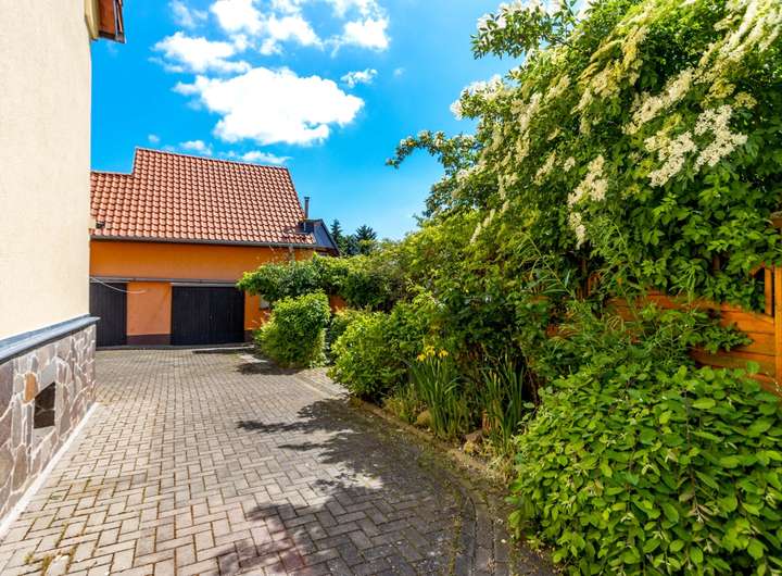 Es handelt sich um ein 2 geschossiges Einfamilienhaus, voll unterkellert in Massivbauweise. Zum Haus gehören ein angelegter, eingefriedeter Garten, ein gepflasterter Innenhof mit Nebengelass, ein überdachter Bereich zum Grillen oder Sitzen und eine Doppelgarage.