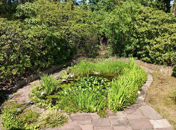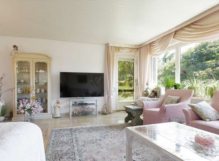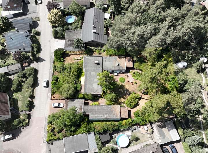 Diese Immobilie ist etwas Besonderes. Auf einem großen Grundstück mit Wald, einem Teich, und beeindruckender Privatsphäre stehen zwei freistehende Bungalows. Das Grundstück ist parkähnlich angelegt und wirkt wie ein eigener kleiner Naturraum. Die Architektur stammt aus dem Jahr 1964. Das Hauptgebäude ist hochwertig gebaut mit dreischaligem Mauerwerk. Die Aufteilung bietet flexible Möglichkeiten für zwei bis drei Wohneinheiten. Der große Bungalow im Überblick Das Hauptgebäude verfügt über zwei getrennt nutzbare Wohnbereiche. Beide sind ebenerdig zugänglich und bilden zusammen eine große Wohneinheit mit sechs Zimmern, zwei Küchen, zwei Badezimmern und einem Gäste-WC. Die Nutzung kann als Einfamilienhaus oder mit Einliegerwohnung erfolgen. Eingangsbereich und erste Wohnung Geradeaus vom gemeinsamen Eingang gelangt man in die kleinere Wohneinheit. Hier befinden sich ein Wohnzimmer, ein Schlafzimmer, ein Badezimmer sowie eine Küche. Dieser Bereich eignet sich gut für Gäste, Angehörige oder als Rückzugsort mit eigenem Zugang. Zweite Wohnung im Haupthaus Vom Eingang aus links liegt die größere Wohnung. Ein Flur mit Zugang zum Teilkeller (mit Sauna) führt weiter zur Küche. Die Einbauküche ist hochwertig ausgestattet, stammt aus dem Jahr 2014 und stammt von Miele. Das helle Wohnzimmer bietet ein behagliches Raumgefühl mit einem Speckstein-Kachelofen. Nebenan liegt das Esszimmer mit Blick in den Garten. Weiterhin gibt es ein Gäste-WC, ein Arbeitszimmer, ein Schlafzimmer sowie ein modernes Badezimmer, das im Jahr 2023 erneuert wurde. Der Flur verfügt über einen maßgefertigten Einbauschrank. Der zweite Bungalow Der 2 Zimmer Bungalow mit circa 55m² eignet sich ideal als Gästebereich, Büro oder zusätzliche Wohneinheit. Man betritt das Haus durch einen hellen Flur. Rechts liegt das Wohnzimmer, geradeaus die Küche. Daneben folgen Badezimmer und Schlafzimmer. Grundstück und Außenbereich Das Grundstück bietet Natur, Ruhe und Struktur in Kombination. Der Garten ist gepflegt und durchdacht angelegt. Der Teich verleiht dem Gelände einen besonderen Charakter. Eine Gartenpumpe in Kombination mit dem hochwertigen Bewässerungssystem der Marke Hunter sorgt für komfortable Pflege. Zwei Garagen und zusätzliche Schuppen bieten ausreichend Stauraum.