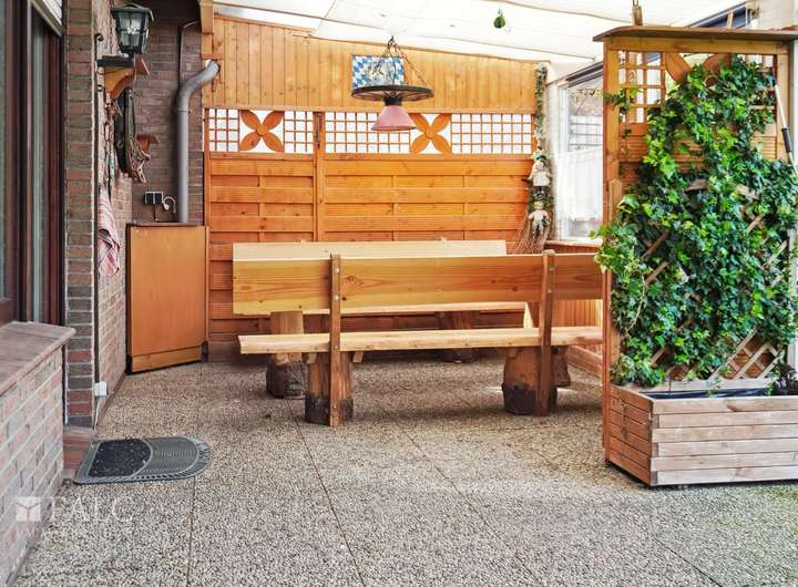 Der direkte Zugang zur Terrasse, die von einer Loggia umgeben ist, steigert den Wohnkomfort enorm und hilft Ihnen, nach einem anstrengenden Tag den Abend gemütlich in Ihrem Garten ausklingen zu lassen. Zusätzlich finden sich hier zwei Holzbänke und ein Holztisch, die perfekt für ein geselliges Beisammensein geeignet sind. Vom weitläufigen Garten, der zum Entspannen, Spielen oder Gärtnern einlädt, gelangen Sie zu einem Gartenhaus, von welchem aus Sie einen perfekten Blick ins Gartenparadies genießen.