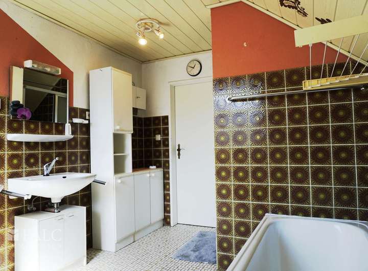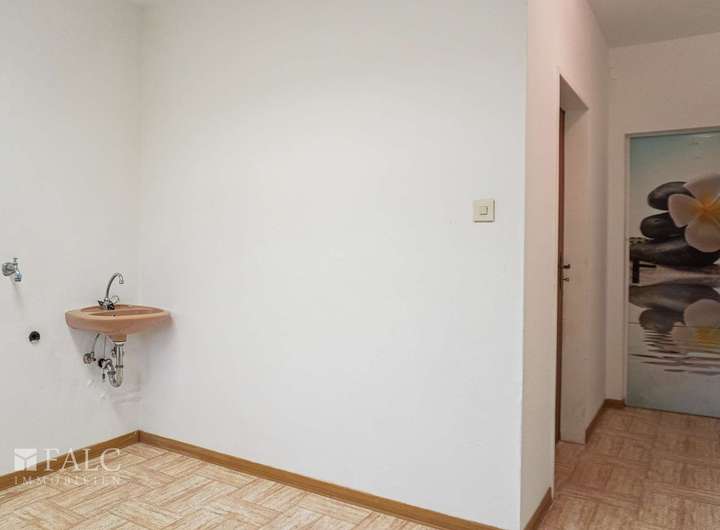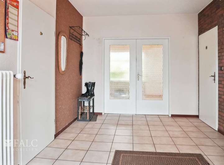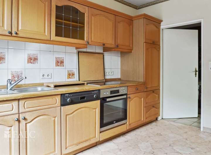 In der Küche und im Wohnzimmer befindet sich ein gut erhaltener PVC Boden. Unter diesem befinden sich noch die Fliesen, die auch den Eingangsbereich verzieren. Die hochwertige Küche aus Eichenholz, die in französischem Stil gehalten ist, ist ebenfalls im Kaufpreis enthalten.