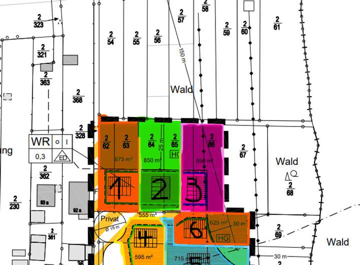 Das gesamte Grundstück umfasst 4.704 m², wovon bereits zwei Parzellen verkauft wurden. Es sind noch 2.896 m² verfügbar, die sich auf vier Grundstücke aufteilen lassen: