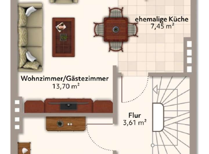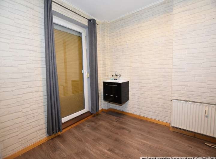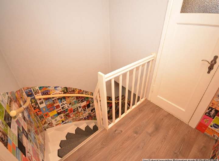 Im Obergeschoss wurde durch Entfernen der Küchenwand ein großer Wohnraum geschaffen, welcher Zugang zum Balkon bietet. Von diesem führt eine Wendeltreppe in den Garten. Besonderheit: Aus der ehemaligen Küche wurden die Wasser-/Abwasseranschlüsse genutzt und ein Waschtisch nebem dem Balkonzugang installiert. Auf dieser Ebene befindet sich ein weiterer Raum, welcher als Schlaf-, Arbeits-, Kinderzimmer oder vielleicht für Ihr Büro genutzt werden kann.