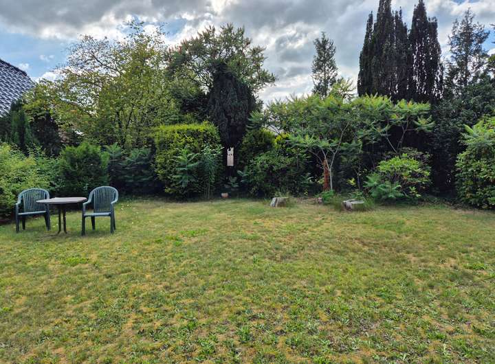 Der pflegeleichte Garten mit Rasen, Sträuchern und Hecken ist ein schöner Ort zum Entspannen und Spielen. Mit einem Bohrbrunnen in der Garage können Sie Wasser sparen und die Pflanzen sowie den Rasen mit Grundwasser versorgen.