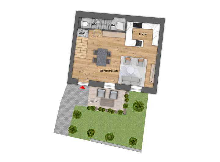 Im Erdgeschoss befindet sich der großzügige, lichtdurchflutete Wohn- & Essbereich mit integrierter Küche. Darüber hinaus steht ein Gäste-WC und ein Abstellraum zur Verfügung.