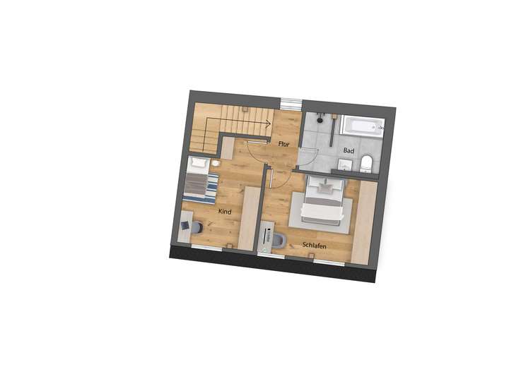 Im Obergeschoss erwartet Sie ein großzügiges Bad mit Großformat-Fliesen und hochwertigen Armaturen sowie 2 (Schlaf-)räume.