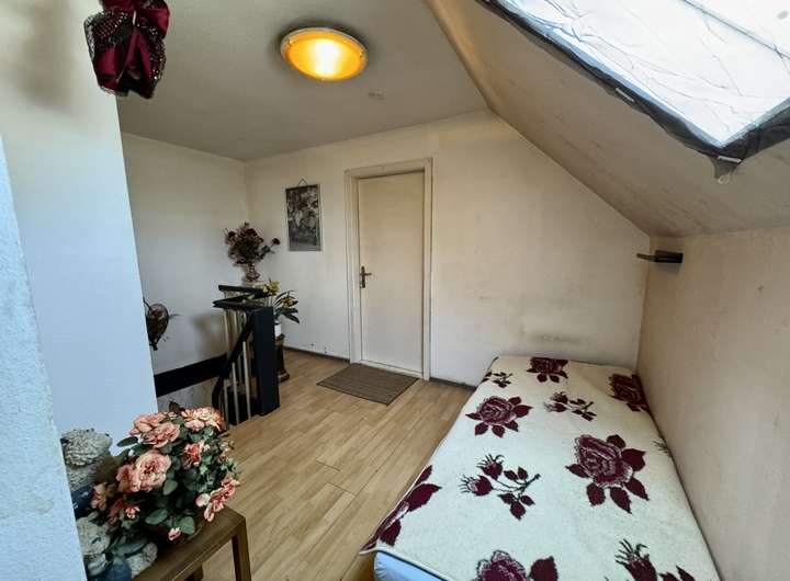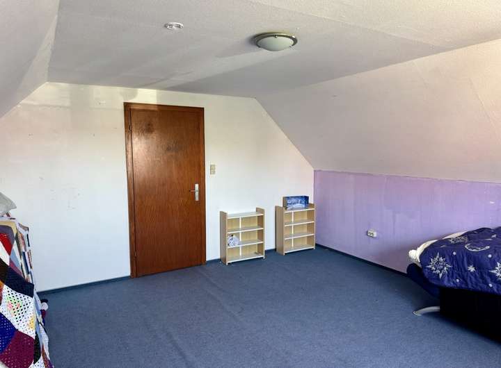 Über eine innenliegende Treppe erreicht man das Dachgeschoss, das derzeit teilweise vom Mieter genutzt wird. Hier stehen zwei Schlafzimmer sowie ein Flurbereich zur Verfügung. Zusätzlich befindet sich im Dachgeschoss noch eine größere, nicht ausgebaute Fläche, die derzeit als Nutzfläche dient und weiteres Ausbaupotenzial bietet.