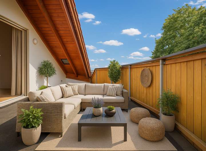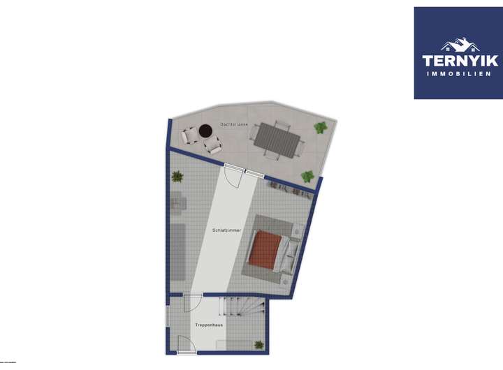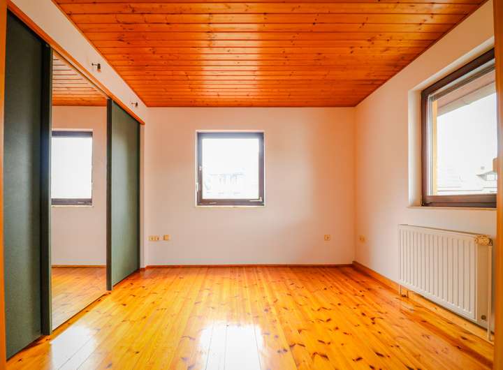 Dachgeschoss (2. OG): Das gemütliche Schlafzimmer mit Zugang zur nicht einsehbaren und großzügigen Dachterrasse rundet das Angebot ab. Hier genießen Sie ruhige Abende, Sonne und Privatsphäre. Auf derselben Ebene befindet sich ein großer, begehbarer Dachbodenraum mit normaler Tür – ideal als Stauraum oder Hobbyfläche.