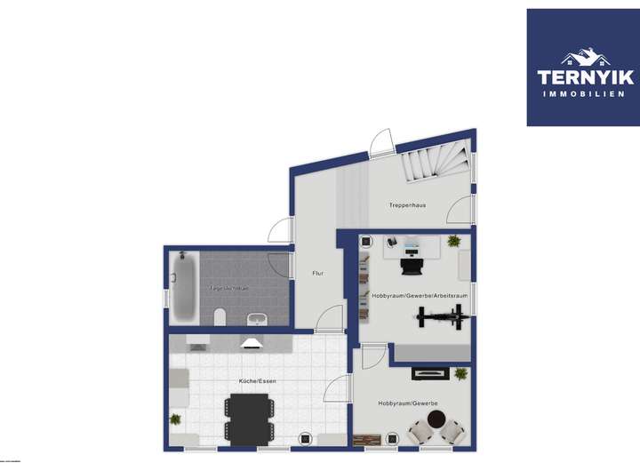 Erdgeschoss (EG): Beim Betreten des Hauses befinden sich rechts die ausgebauten Kellerräume, links liegen zwei große Zimmer und ein Bad. Die Küche im EG ist vorbereitet für eine moderne Kochinsel mit freistehender Dunstabzugshaube. Auch ein Esstisch findet hier bequem Platz. Der angrenzende Raum bietet flexible Nutzungsmöglichkeiten – etwa als Büro, Kosmetikstudio oder Hobbyraum. Zusätzlich befindet sich im EG ein Tageslichtbad mit bodentiefer Wanne – ideal für entspannte Momente.
