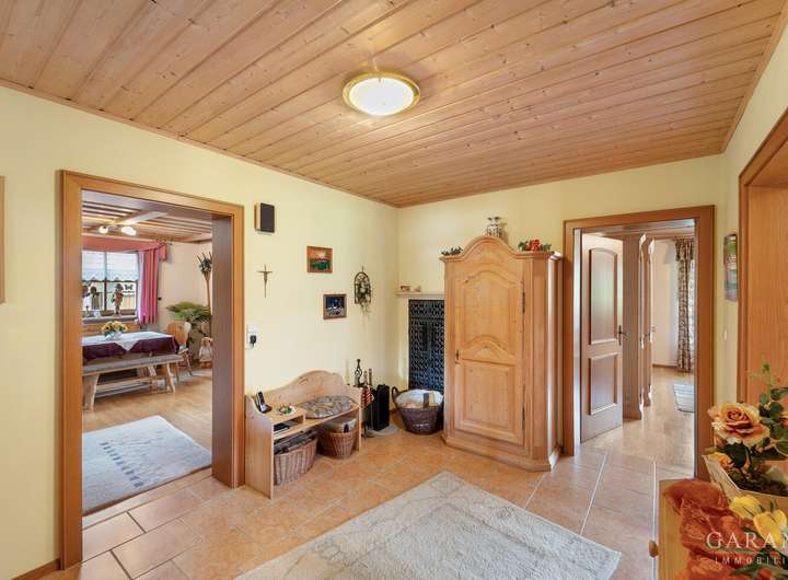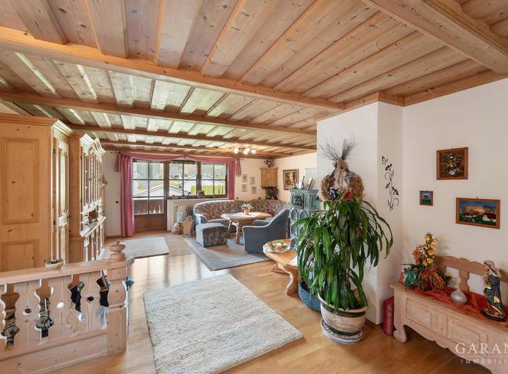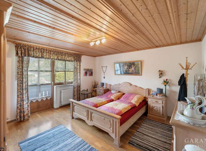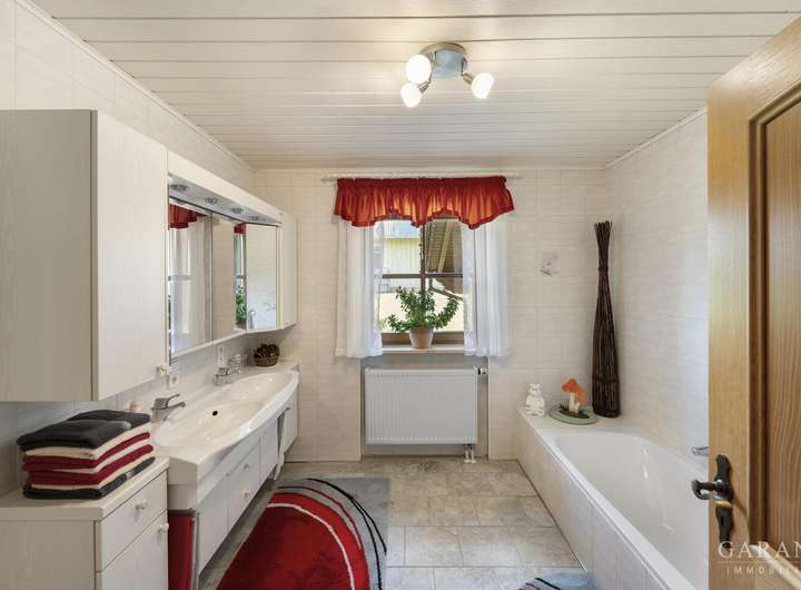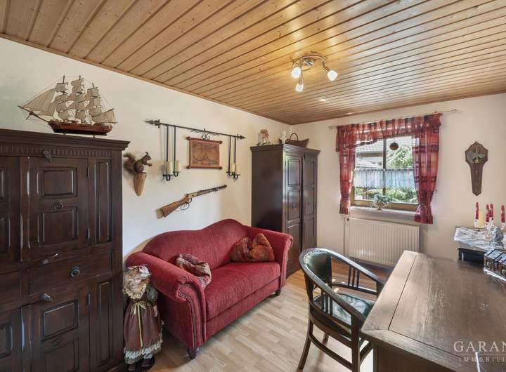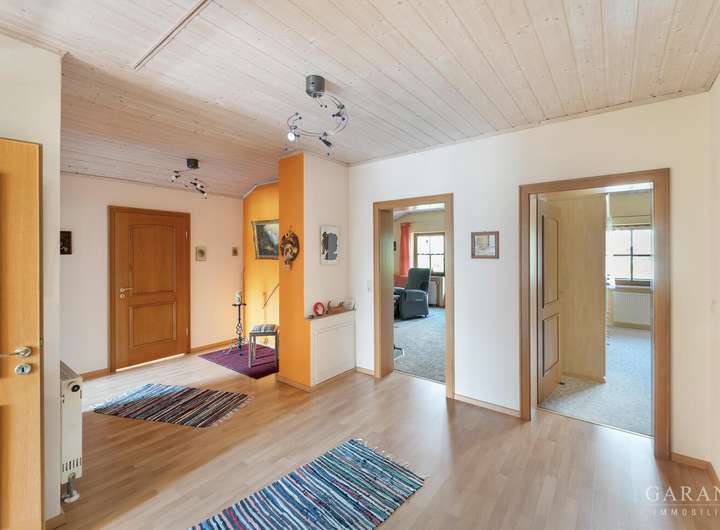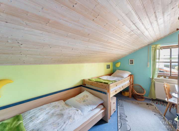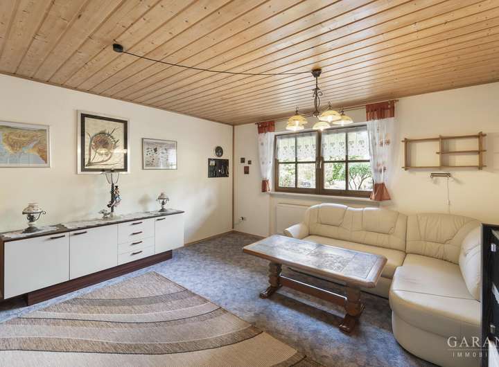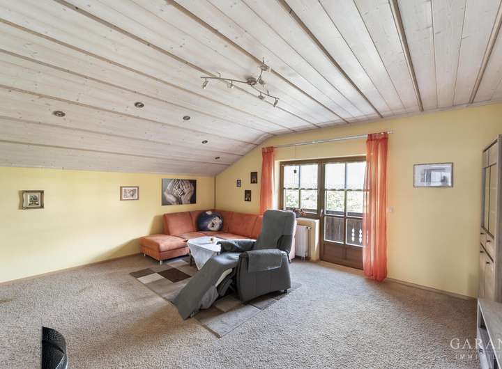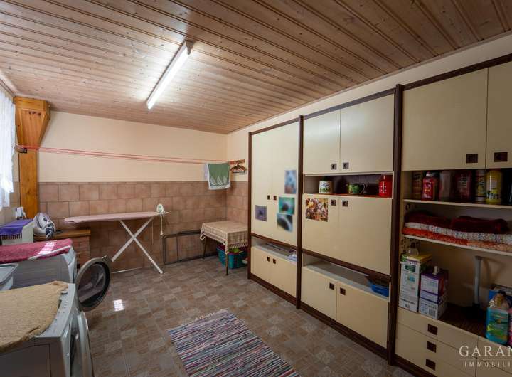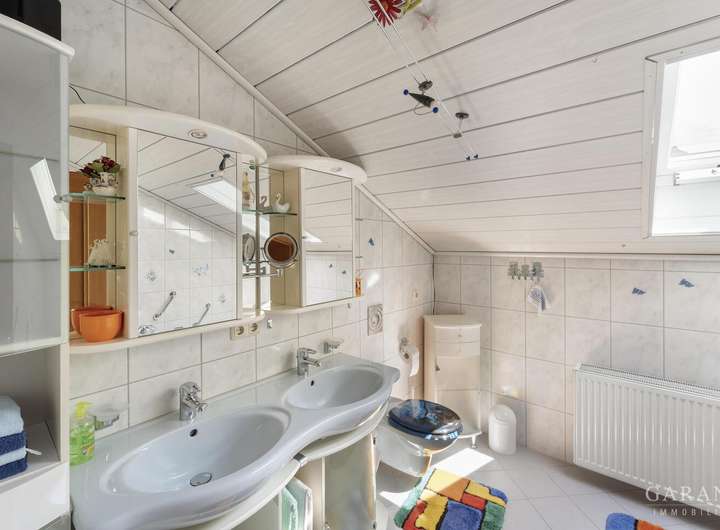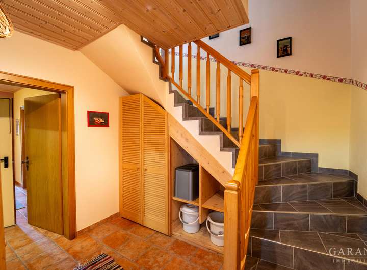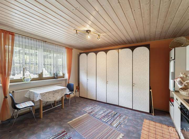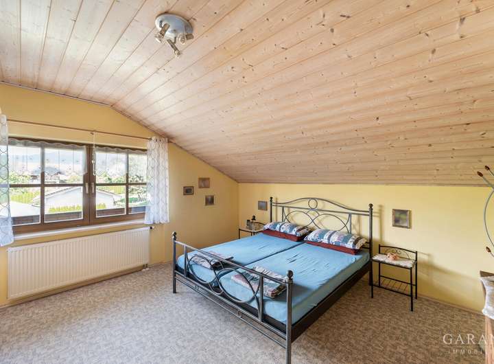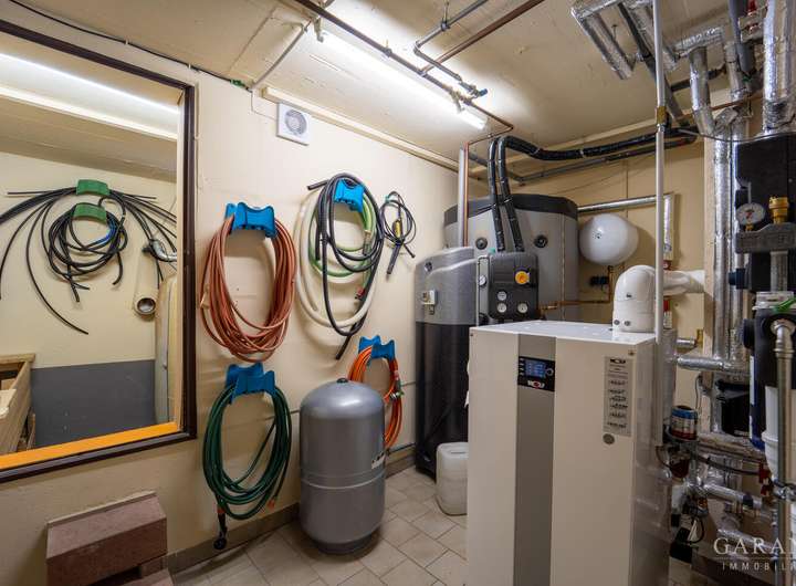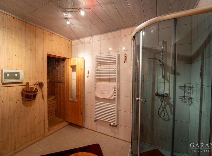 Für zusätzlichen Komfort sorgen ein Wintergarten, eine große Terrasse mit elektrischer Markise und Sichtschutz, ein wohnlicher Kachelofen im Erdgeschoss, ein Schwedenofen im Dachgeschoss sowie eine Sauna mit eigenem Bad im Untergeschoss. Eine Garage mit Platz für zwei Fahrzeuge, ein Werkstattraum und ein separater Waschraum im Keller runden das funktionale Raumangebot mit weiteren 113 m² Nutzfläche ab.