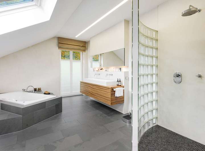 - Helles Hauptbad (Obergeschoss), gestaltet mit Schiefer-Bodenfliesen und cremefarben gespachtelten Wänden, ausgestattet mit Whirlwanne (Ideal Standard), bodengleicher Walk-in-Dusche einschl. Rainshower und Mosaikfliesen-Boden, breitem Corian-Waschtisch einschl. Unterschrank aus Zebrano-Holz, WC (Duravit), Dornbracht-Kreuzgriff-Unterputzarmaturen („Tara“), Einbauschrank mit Zebrano-Fronten, deckenbündigem Lichtband, flächenbündigen Wandspots und Raffrollo