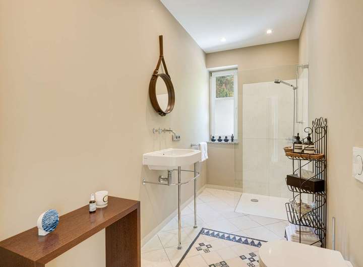 - Duschbad (Untergeschoss), gestaltet mit hellen, gebrochenen Naturstein-Bodenfliesen und cremefarben gespachtelten Wänden, ausgestattet mit bodengleicher Dusche samt Handbrause und Schwallauslass, Waschbecken (Duravit „Happy D“), Dornbracht-Armatur („Tara“), WC (Duravit) und Deckenspots