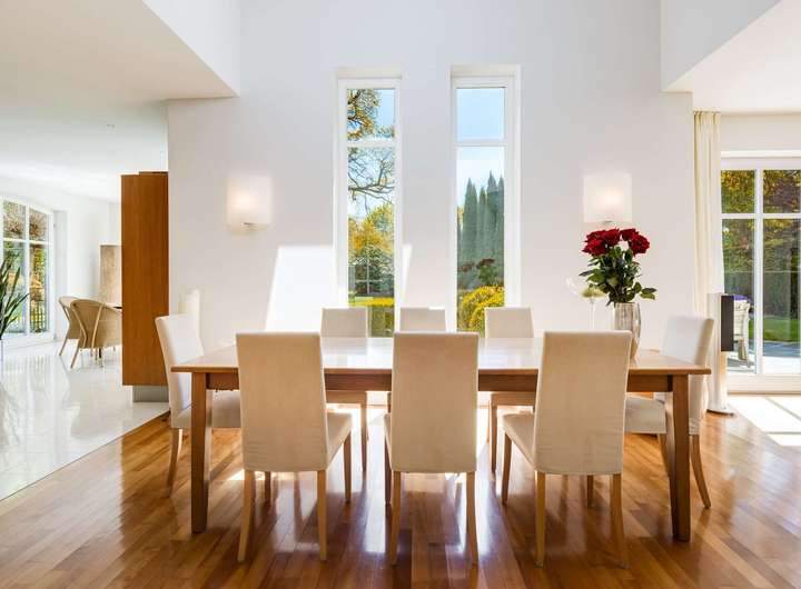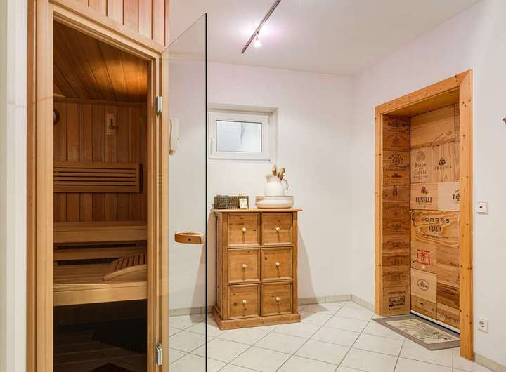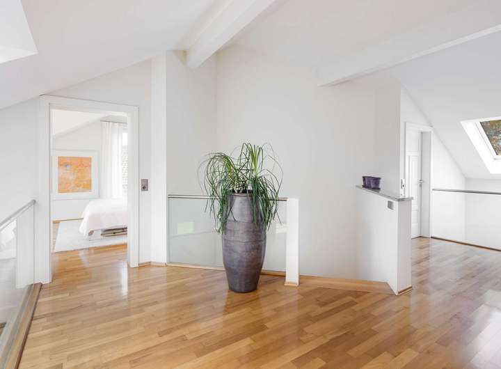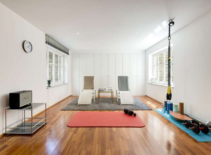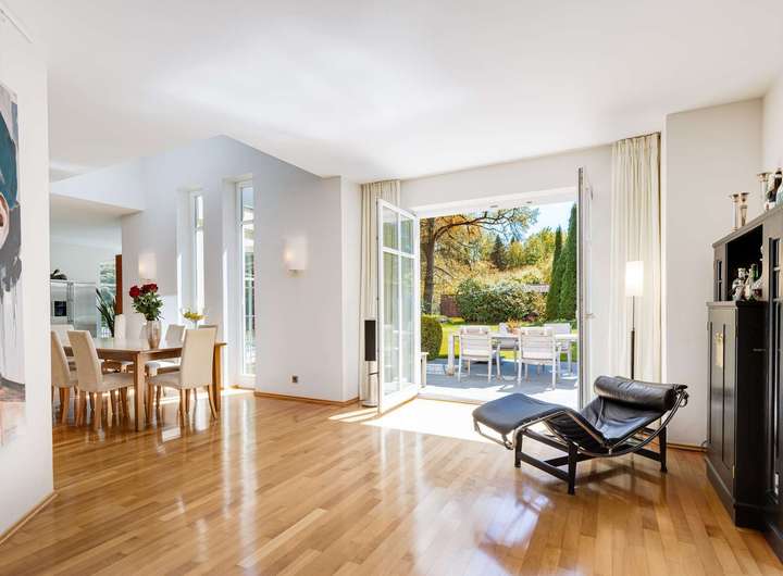Das Raumangebot verteilt sich über ca. 292 m². Im Erdgeschoss wurden Wohnen, Essen und Kochen großzügig und modern interpretiert; hinzu kommen ein Arbeits-/Gästezimmer und ein Duschbad. Das Obergeschoss bietet drei mögliche Schlafzimmer und ein Bad. Im größtenteils taghellen Souterrain sind weitere wohnlich gestaltete Räume, eine Sauna, ein Technik-/Hauswirtschaftsraum sowie ein klimatisierter Weinkeller untergebracht. Ein Teil der Souterrain-Räume besitzt einen eigenen Außenzugang und lässt sich als autarke Einheit nutzen. Das Highlight ist ein weitläufiger, hinreißend angelegter Garten mit perfekter Ausrichtung nach Osten, Süden und Westen.