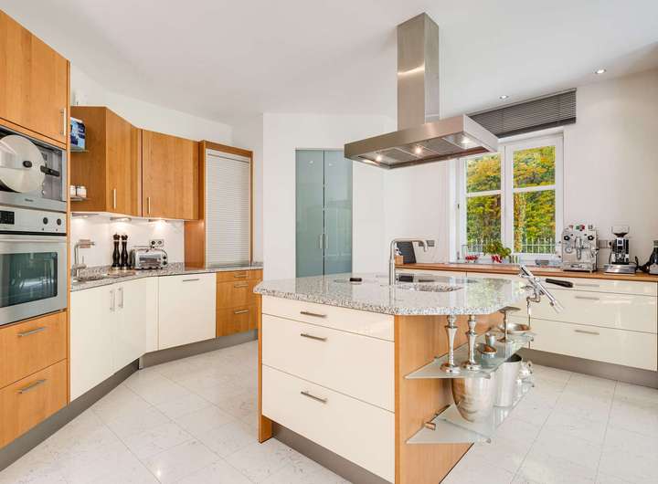 - Einbauküche (Dross + Schaffer) mit cremefarbenen bzw. Kirschholz-Fronten, Granit-Arbeitsflächen und Koch-/Arbeitsinsel, ausgestattet mit Cerankochfeld, Backofen (beides Küppersbusch), Insel-Dunstabzug (Gutmann), Geschirrspüler (Miele, neu 2021), Side-by-Side Kühl-Gefrier-Kombination mit Edelstahl-Fronten und Icemaker, zwei Spülbecken