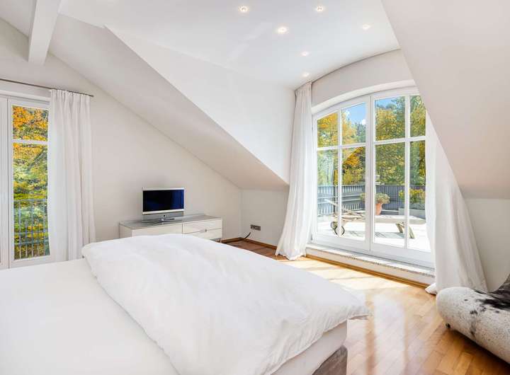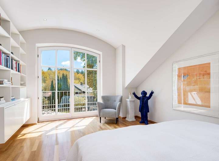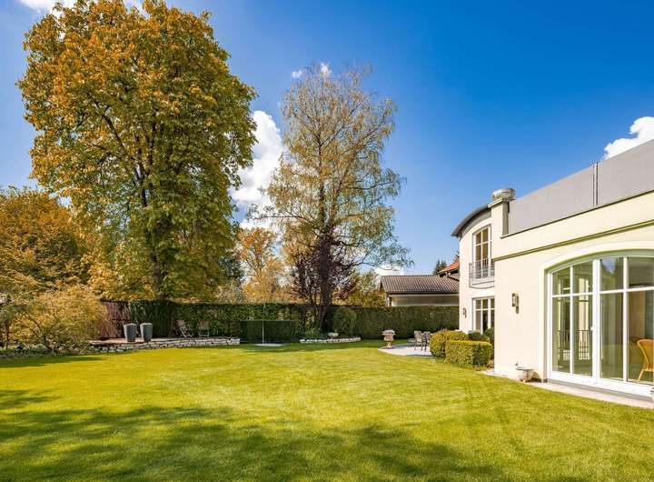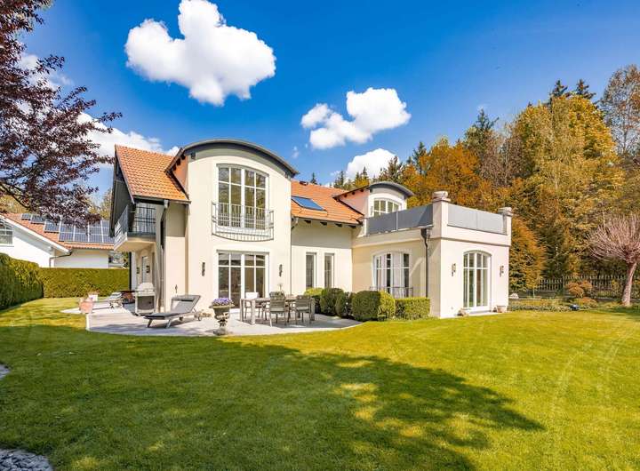 Die ebenso hochwertige wie zeitlos-elegante Ausstattung umfasst Kirschholz-Parkett mit Fußbodenheizung, weiße Sprossenfenster, eine Einbauküche, Kamin, Sauna, Maßeinbauten und einen Wäscheabwurf. Beheizt wird mittels einer 2018 erneuerten Grundwasser-Wärmepumpe. Eine Doppelgarage macht diese anspruchsvolle Familienvilla in absolut idyllischer Waldrandlage perfekt.