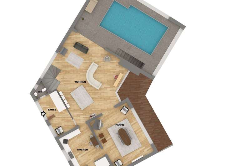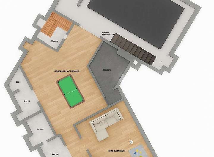 AUSZUGSWEISE: 1. Wohngebäude 1.1. Allgemein - Ursprungsbaujahr 1972 - 2-Schalen-Mauerwerksbau (hinterlüftet), Massivklinkerstein außen, Kalksandstein innen - Wohnfläche ca. 535 qm (davon ELW ca. 180 qm) - Nutzfläche ca. 208 qm - Hallenschwimmbad (beheizt) - drei Wohnebenen - unterkellert - drei Wohnebenen - Echtholzfenster, isolierverglast - Gaszentralheizung (Bj. 06/24, Leistung 50 KW, App-gesteuert), Heizkörper - Photovoltaik-Anlage mit Batteriespeicher (Bj. 06/24, Leistung 10,26 KwP, App-gesteuert) - aufschaltbare Alarmanlage 1.2. Erdgeschoss - Wohn-/Essbereich mit offenen Kamin (ca. 94 qm) - Küche mit EBK (neu: 11/23) + HWR - Hallenschwimmbad (ca. 70 qm) - große, vorgelagerte Terrasse - Entrée - Gäste-WC 1.3. Dachgeschosse Das Dachgeschoss des Hauses beinhaltet zwei, übereinander liegende Ebenen (Geschosse) und ist vollständig zu Wohnzwecken ausgebaut. Aufgrund der eingebauten Gauben sowie der starken Dachneigung haben Dachschrägen nur geringen Einfluss auf die nutzbare Wohnfläche der Ebene I. 1.3.1. DG - Ebene I - Master-Bedroom mit Ankleide; klimatisiert, Loggia - Master-Bad - ggf. Einliegerwohnung ... Wohnraum mit Loggia ... Schlaf-/Gästezimmer mit Loggia ... Küche ... Bad ... Duschbad ... Diele ... sep. Außenzugang 1.3.2. DG - Ebene II Die Ebene II des Dachgeschosses ist vollständig zu Wohnzwecken ausgebaut, zweigeteilt und über separate Aufgänge zu erreichen. Die Raumhöhen betragen bis zu fünf Meter. - Gästezimmer mit sep. Zugang von Ebene I - ggf. Einliegerwohnung ... drei Zimmer ... Diele ... Abstellkammer ... sep. Zugang von Ebene I 1.4. Kellergeschoss Das Kellergeschoss ist weitgehend ausgebaut und verfügt über eine lichte Raumhöhe von ca. 230 cm. - Musik-/Kinoraum mit akustischer Dämmung, Tageslicht und Heizung - Gesellschaftsraum (Billiard, Tischfußball, Bar) im Mittelteil des Kellers - Sauna - WC - Wasch-/Trockenraum mit angrenzenden Vorrats-/Weinkeller - Werkstatt - Heizungsraum - Technikraum Schwimmbad 2. Nebengebäude - Zwei Garagen mit elektrisch betriebenen Toren und Stellplatz für bis zu drei KFZ - Geräte-/Technikraum - Brunnenanschluss für Brauch- und Gartenwasser - WC - PV-Anlage (Dach) mit Energiespeicher 3. Außenanlagen - Grundstücksgröße ca. 2.066 qm - private Grundstückszufahrt (ca. 100 m) - Gartenbereich mit parkähnlicher Bepflanzung und Pavillon - Terrassenbereich mit Markisen und Außenkamin