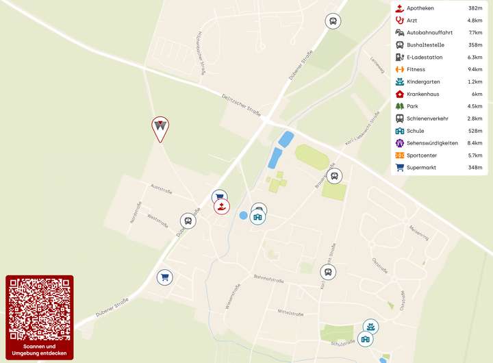 Die Nahversorgung ist in Krostitz hervorragend. Der nächste Supermarkt ist nur 350 Meter entfernt, ebenso wie eine Bushaltestelle, die eine unkomplizierte Anbindung an den öffentlichen Nahverkehr ermöglicht. Mit der Linie 196 fahren Sie gerade einmal 25 Minuten bis nach Leipzig. Nach Delitzsch gelangen Sie mit der Linie 212 in ebenfalls nur 25 Minuten.