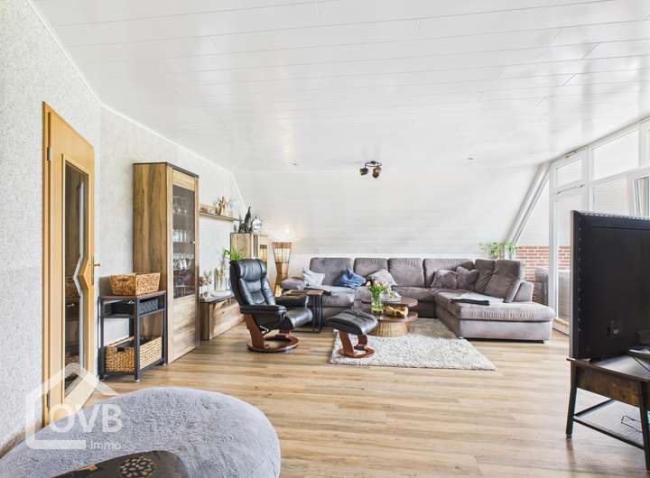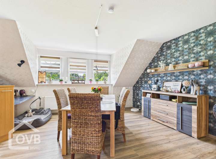 Im Erdgeschoss finden Sie ein Wohnzimmer mit Kamin, zwei Wohn-/Esszimmer, zwei Badezimmer und einen Abstellraum. Im Dachgeschoss befinden sich zusätzlich drei Schlafzimmer.