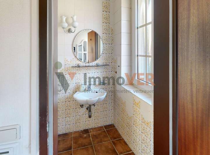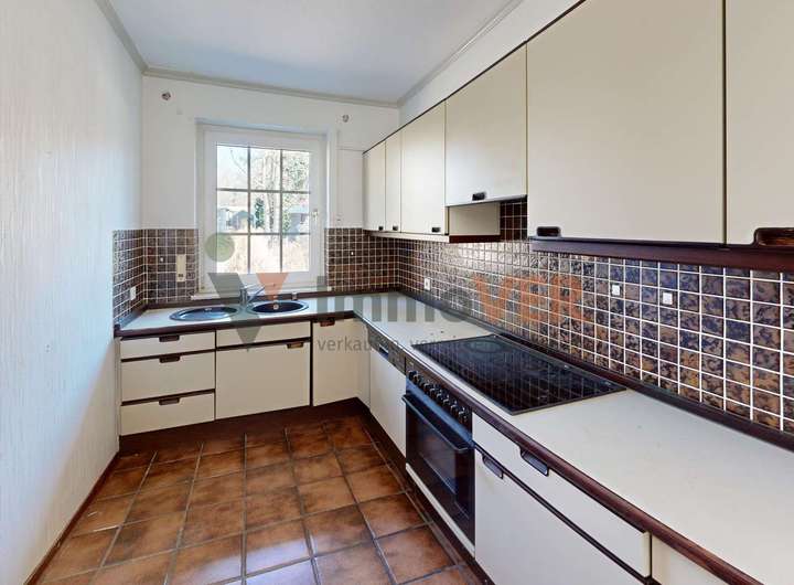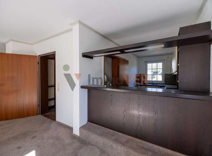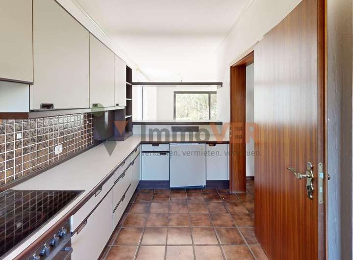 Angrenzend an den Wohnbereich befindet sich die Küche mit einer in die Jahre gekommenen Einbauküche. Eine große Durchreiche sorgt für eine kommunikative Verbindung zwischen Küche und Wohnbereich – ideal für gesellige Abende oder das schnelle Servieren von Speisen.