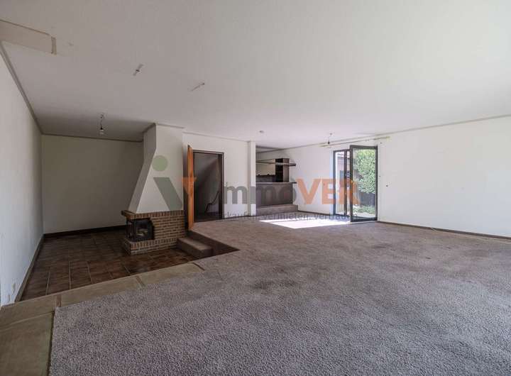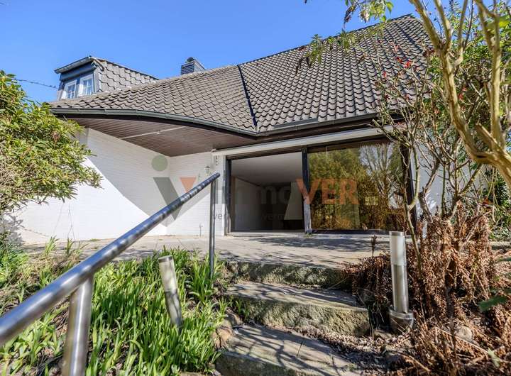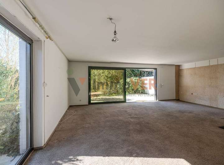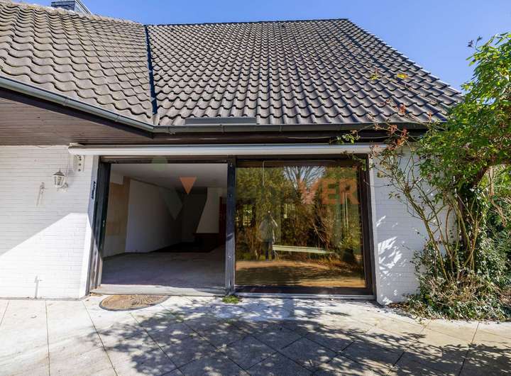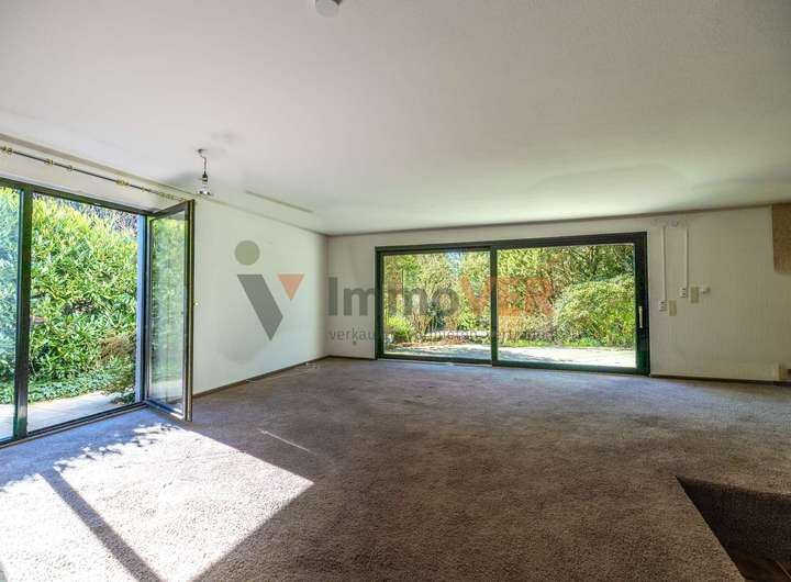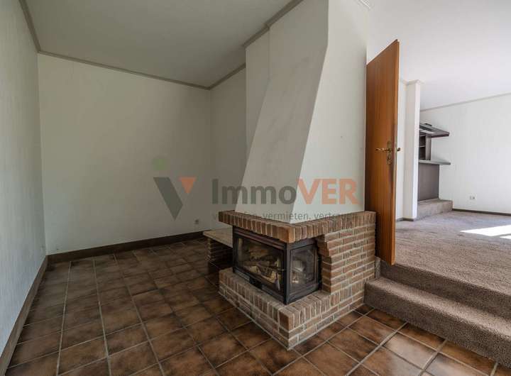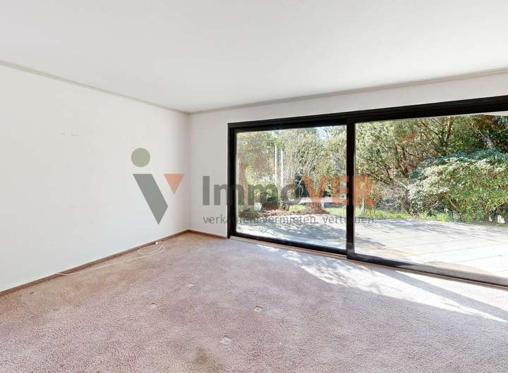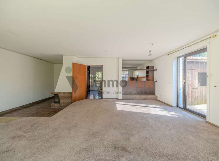 Herzstück des Erdgeschosses ist das etwa 54 m² große Wohnzimmer, das mit seiner großzügigen Fläche, einer charmant abgesenkten Kaminecke und den großen, bodentiefen Fenstern begeistert. Diese öffnen den Raum nicht nur optisch, sondern führen direkt hinaus auf die sonnige Terrasse und in den traumhaften Garten – ein Ort der Ruhe und Erholung. Ein zusätzlicher seitlicher Zugang zum Garten, direkt vom Wohnzimmer aus, ermöglicht den direkten Weg zum Gartenschuppen und schafft eine praktische Verbindung zur Auffahrt mit Carport.