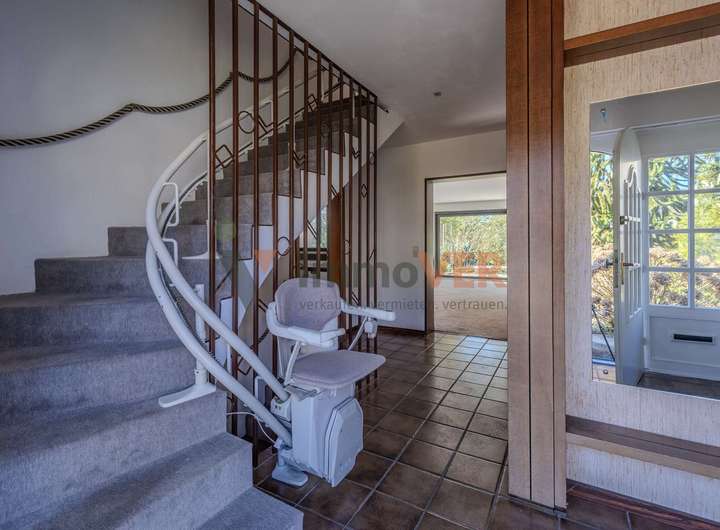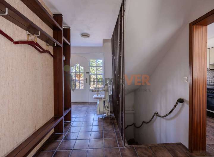 Bereits beim Betreten des Hauses empfängt Sie ein weitläufiger Eingangsbereich, der nicht nur genügend Platz für eine Garderobe bietet, sondern auch direkten Zugang zum Gäste-WC sowie zum Keller und Dachgeschoss ermöglicht. Der erste Eindruck vermittelt Offenheit und eine klare Struktur – ideal, um Gäste willkommen zu heißen oder den Alltag entspannt zu beginnen.